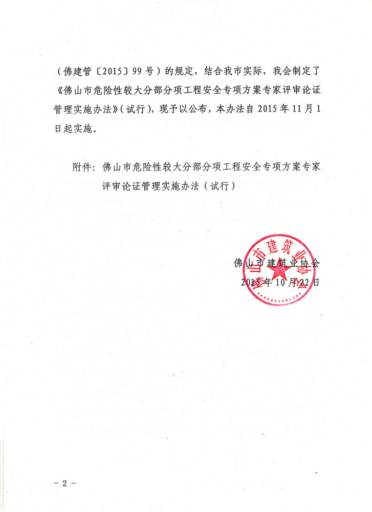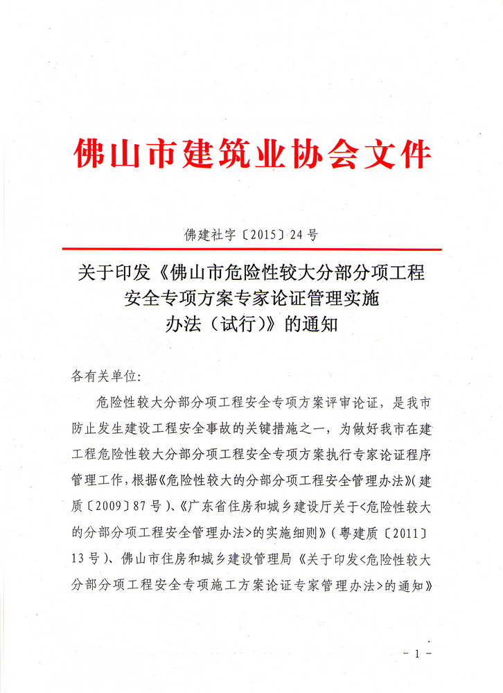 關(guān)于印發(fā)《佛山市危險(xiǎn)性較大分部分項(xiàng)工程安全專項(xiàng)方案專家論證管理實(shí)施辦法(試行)》的通知(佛建社字〔2015〕24號(hào))