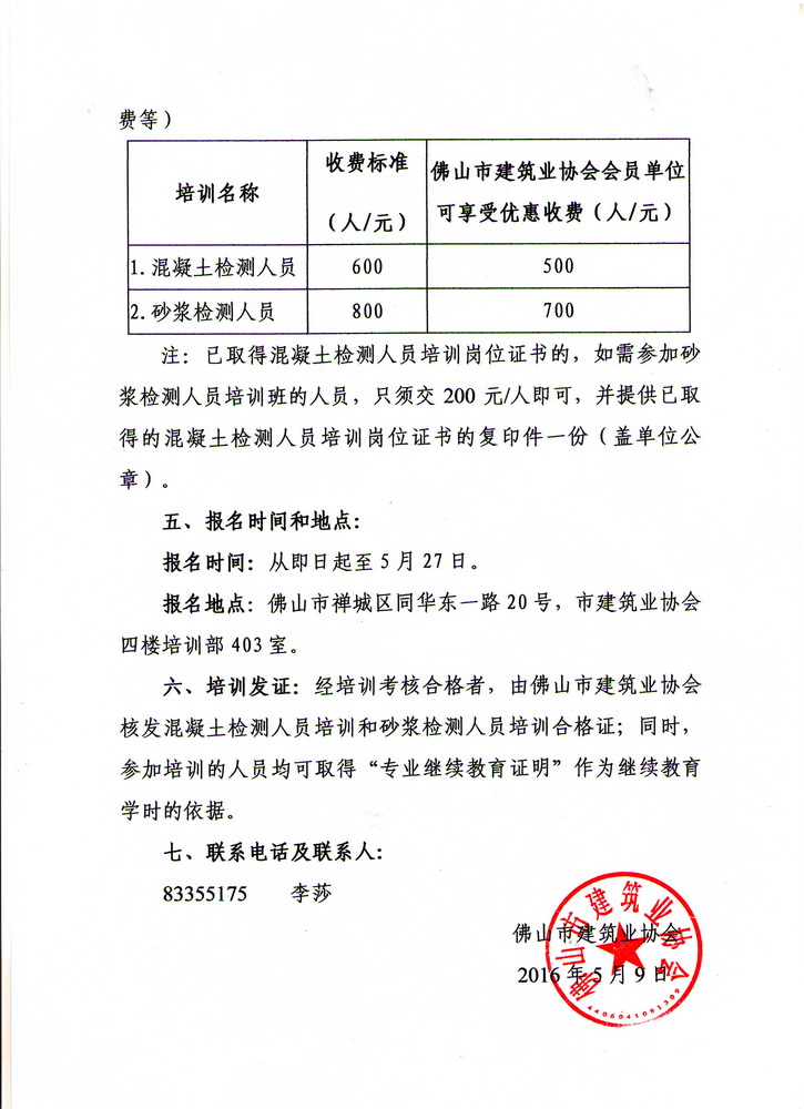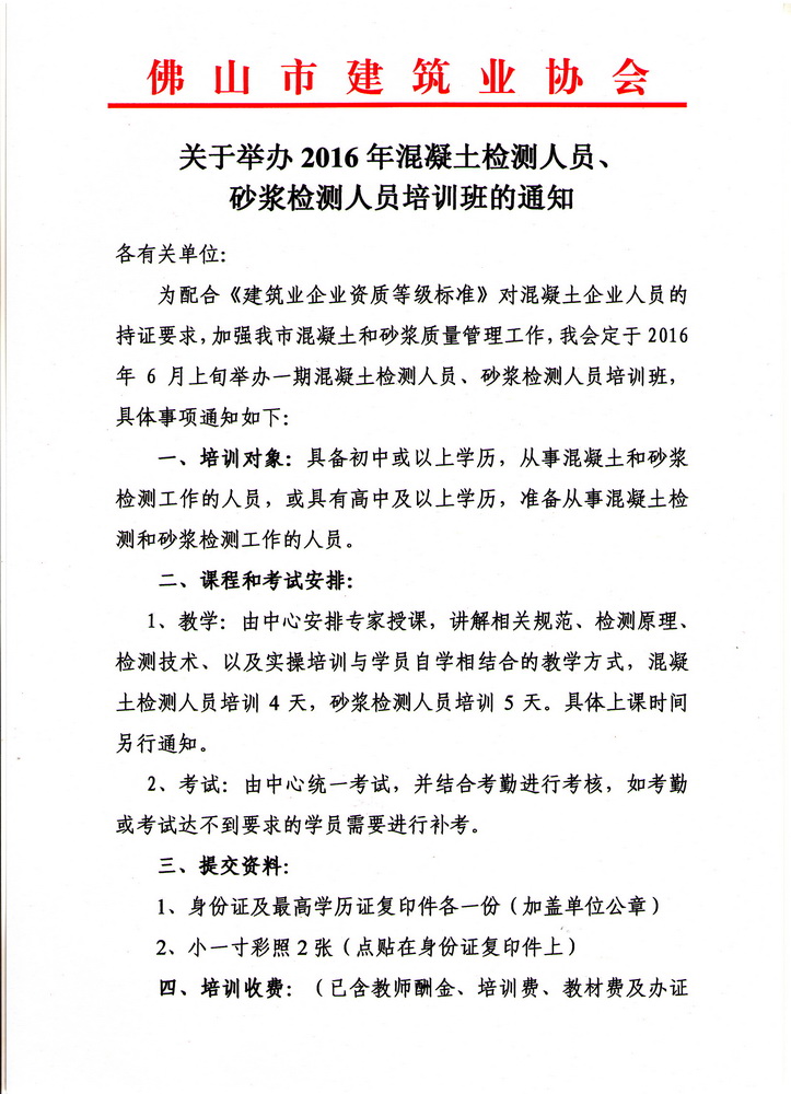 關(guān)于舉辦2016年混凝土檢測(cè)人員、砂漿檢測(cè)人員培訓(xùn)班的通知(2016/05/10)