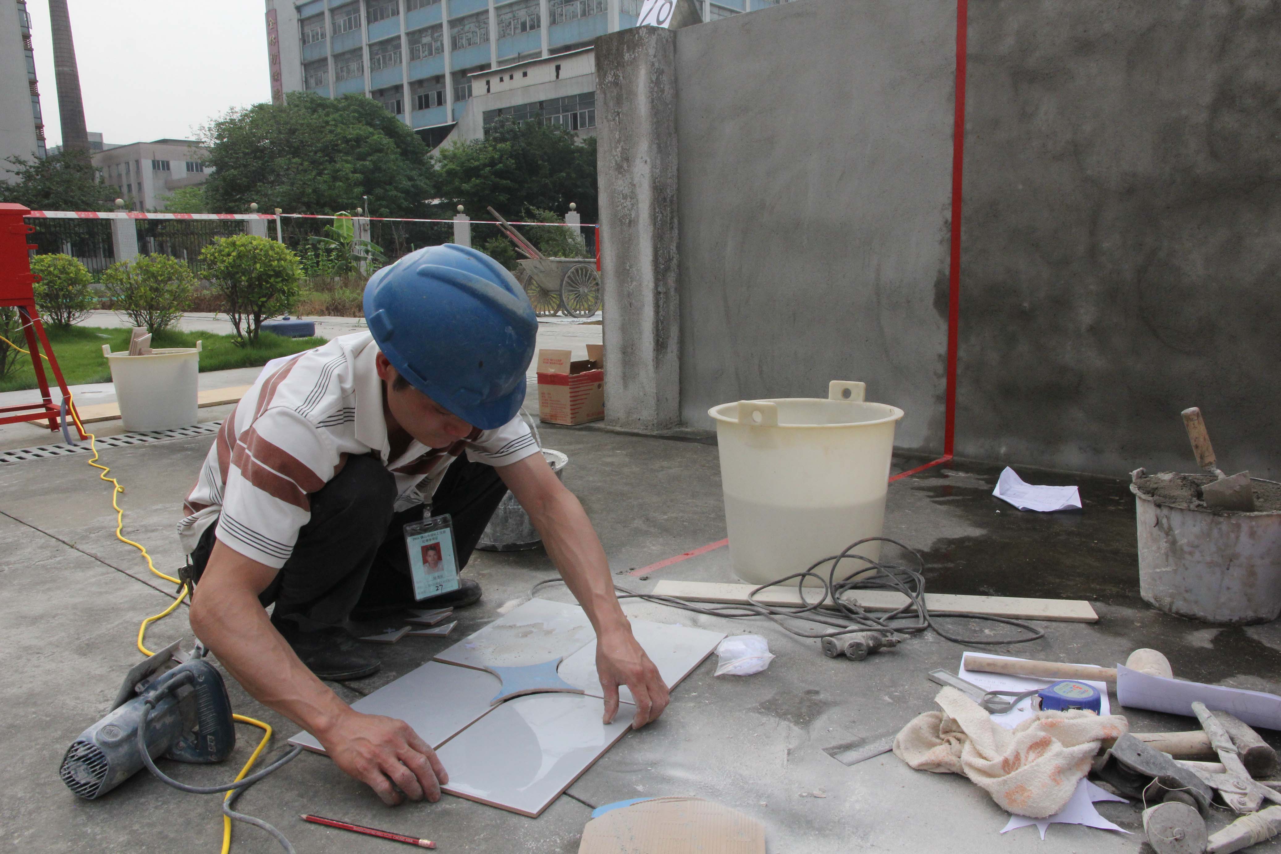 在選手隨機(jī)抽取的工位上,只見切割機(jī)、灰桶、墨斗、線錘、水平尺等“比賽武器”整齊地一路排開,在裁判長(zhǎng)的一聲令下,已在摩拳擦掌的各路好手便開始爭(zhēng)分奪秒地“拼湊”自己的作品。有的選手選擇先把準(zhǔn)備“上鍋”的原材料都準(zhǔn)備好,麻利地把所需的瓷磚浸泡到水里,然后不慌不忙地畫出比賽規(guī)定的拼花樣式;有的選手選擇先把“盛菜的盤子”擺弄好,謹(jǐn)慎細(xì)致地量度鋪砌瓷磚的準(zhǔn)確位置和尺寸;有的選手則選擇先去調(diào)配好“炒菜”必需的“調(diào)味料”,一馬當(dāng)先地去調(diào)配好鋪磚使用的水泥漿。盡管每個(gè)人的工藝操作流程不盡相同,但是每位選手都在用心地制作,細(xì)細(xì)地打磨剛切割出來的瓷片、熟練地把水泥漿涂抹平整、邊量度邊把打磨好的瓷片鋪貼在墻面上、小心翼翼地擦洗干凈已經(jīng)鋪貼好的瓷磚面……每一個(gè)步驟都那么的一絲不茍。