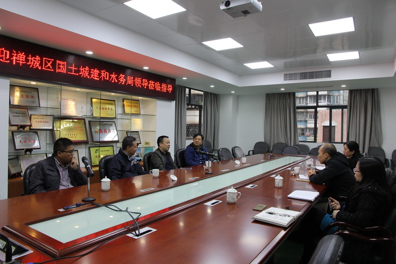 禪城區(qū)國(guó)土城建和水務(wù)局李朝相總工程師(左三)、建筑市場(chǎng)和設(shè)計(jì)管理科科長(zhǎng)張子文(左二)、副科長(zhǎng)姜繼周(左一)