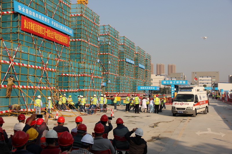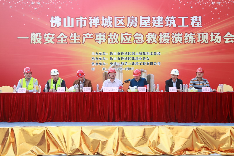 為進一步維護我區(qū)正常的社會秩序和工作秩序,積極應(yīng)對和及時處理可能發(fā)生的較大安全事故,高效、有序地組織事故搶救工作,最大限度地減少人員傷亡和財產(chǎn)損失,受禪城區(qū)國土城建和水務(wù)局委托,2016年12月9日下午,由禪城區(qū)國土城建和水務(wù)局主辦、區(qū)建筑業(yè)協(xié)會承辦、中建二局第三建筑工程有限公司協(xié)辦的“佛山市禪城區(qū)房屋建筑工程一般安全生產(chǎn)事故應(yīng)急救援演練”在中建二局第三建筑工程有限公司總承包施工的“佛山綠島湖地塊二(一標(biāo)段)多層住宅及地下室工程”工地內(nèi)舉行。佛山市禪城區(qū)公安消防大隊、佛山市公安局禪城分局、佛山市公安局禪城分局交警大隊,佛山市禪城區(qū)南莊醫(yī)院,佛山市禪城區(qū)建設(shè)工程質(zhì)量安全監(jiān)督站,廣東達安項目管理有限公司等單位參加了此次演練。禪城區(qū)有在建項目的各施工企業(yè)法人代表和安全生產(chǎn)負(fù)責(zé)人近200人到場觀看了演練。