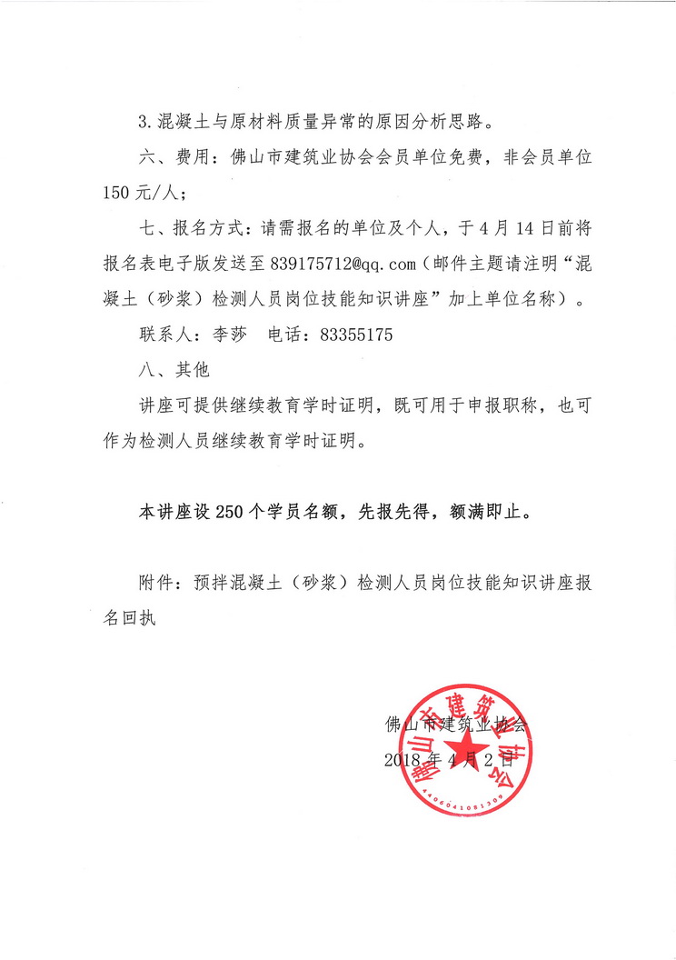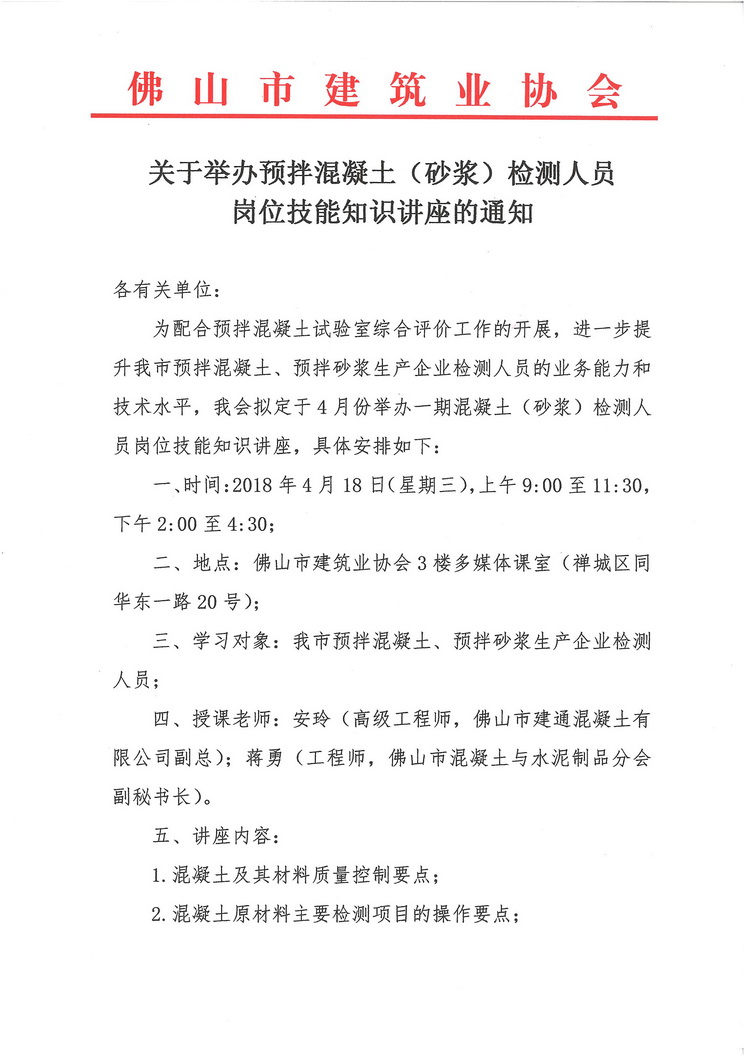 關(guān)于舉辦預(yù)拌混凝土(砂漿)檢測人員崗位技能知識講座的通知(2018/04/02)
