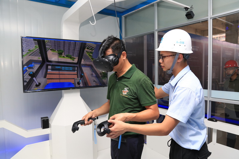 觀摩人員在進行VR技術支持下的建筑安全體驗