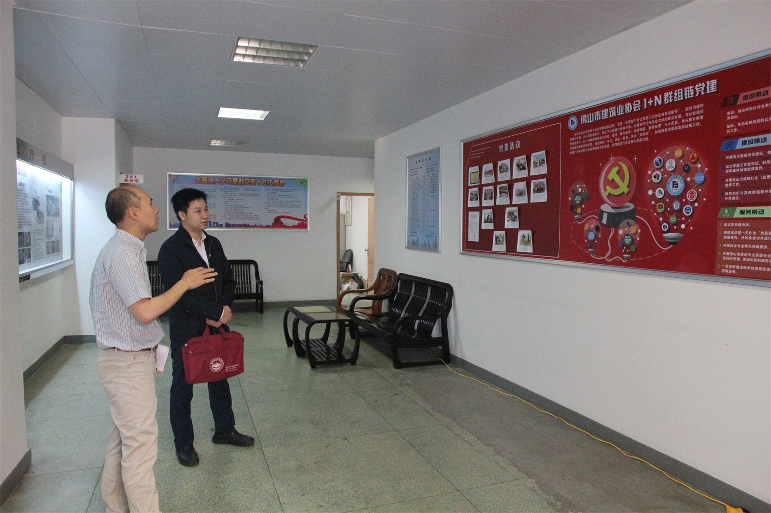 我會(huì)黨支部書記雷毅文(左一)在向佛山市委組織部組織三科科長(zhǎng)潘子安(右一)介紹我會(huì)的黨建設(shè)施布置