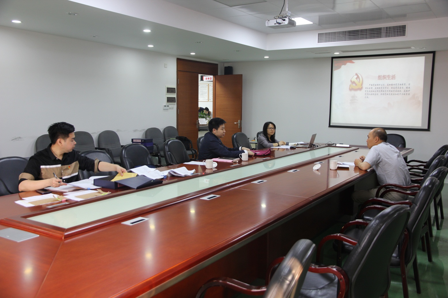 潘子安科長(zhǎng)(左二)、市直黨建工作指導(dǎo)員何恩榮(左一)正在聽取我支部黨建經(jīng)費(fèi)的使用情況