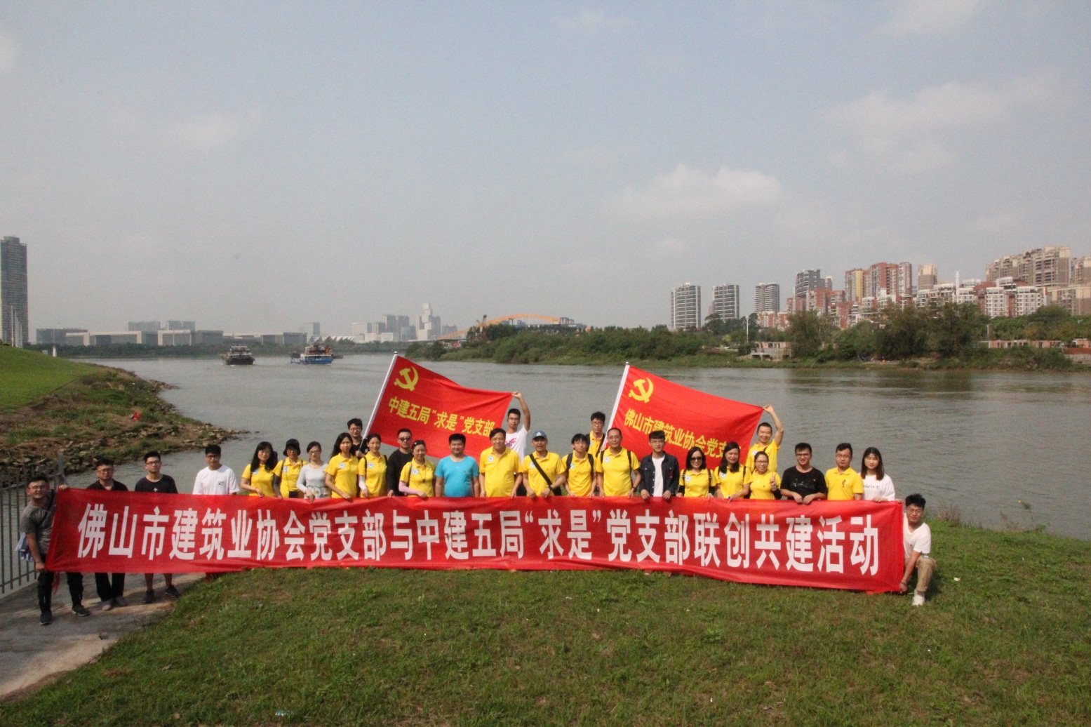 佛山市委組織部組織三科的潘子安科長(左五)、市建筑業(yè)協(xié)會(huì)黨支部雷毅文書記(左四)、中建五局“求是”黨支部尹周書記(右五)