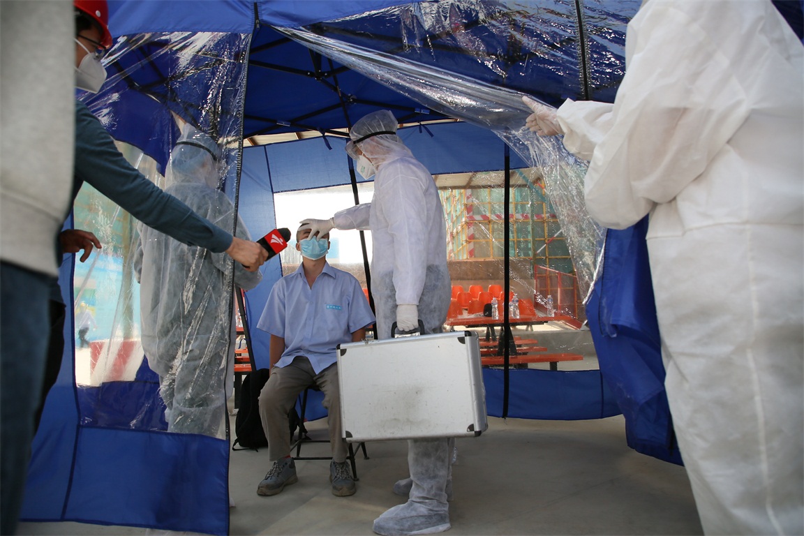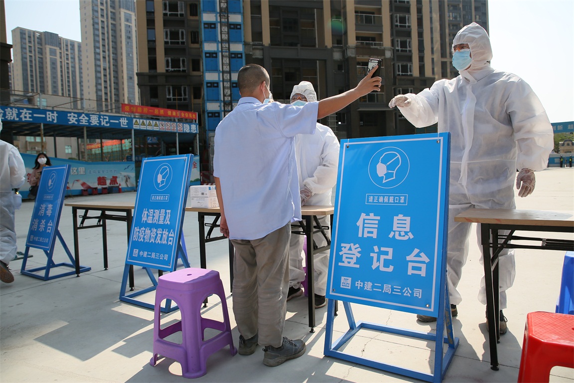 禪城區(qū)房屋建筑工程疫情防控演練中,項目部對返崗人員進行信息登記及體溫測量