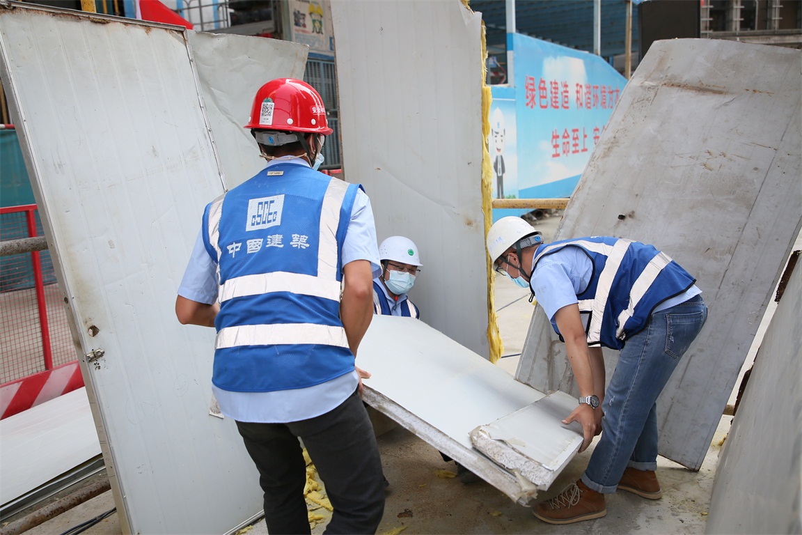 緊接著“禪城區(qū)房屋建筑工程安全生產(chǎn)事故及自然災害應急演練”隨即拉開,演練模擬佛山市氣象臺已發(fā)布防臺風Ⅳ級應急響應預警信號,預計可能升級為防臺風Ⅲ級應急響應預警,禪城區(qū)住建局通知各企業(yè)、項目部盡快組織人員檢查項目工地設施,對設備設施進行排查、加固,防止事故發(fā)生。中建二局第三建筑工程有限公司金茂綠島湖項目部經(jīng)理馬上按要求布置好各項工作。此刻,臺風突然轉向,風力逐步加大并正面襲擊本市區(qū)段,禪城區(qū)住建局啟動防臺風Ⅱ級應急響應預警,通知各企業(yè)、項目部必須立即啟動防臺風Ⅱ級應急響應。區(qū)住建局發(fā)布撤離人員信息,項目經(jīng)理接到通知后,馬上組織人員撤離生活區(qū),前往安置點佛山市外國語學校。然而,項目倉庫管理員撤離到安置點后私自返回項目部倉庫,因臺風升級,風力加大,導致加固的庫房被吹垮,倉管員被困,情況十分危急。項目經(jīng)理立即向禪城區(qū)建筑工程質量安全監(jiān)督站、區(qū)住建局、中建二局三公司匯報,并立即啟動項目部應急預案,在區(qū)住建局應急指揮辦、公司應急辦公室的遠程指揮下進行搶險救援。通過應急救援隊員的努力,順利救出傷員,并通過120救護車將傷員送往醫(yī)院治療。