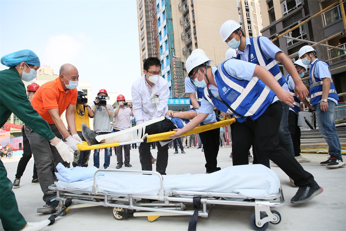 禪城區(qū)房屋建筑工程安全生產(chǎn)事故及自然災害應急演練中,應急救援隊員將傷者抬上擔架