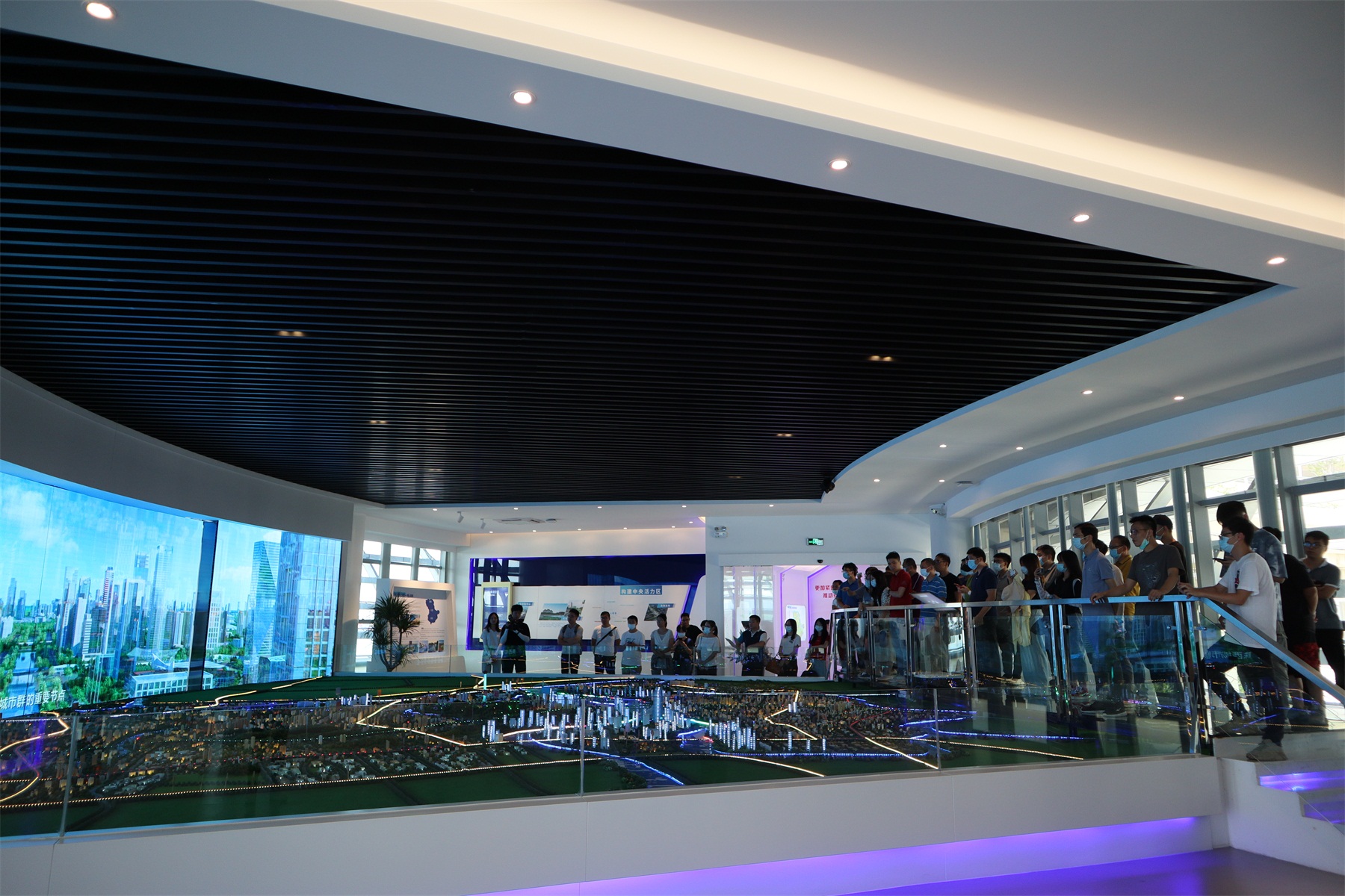 培訓(xùn)人員在展廳觀看關(guān)于德勝新城中軸線公園項(xiàng)目的介紹