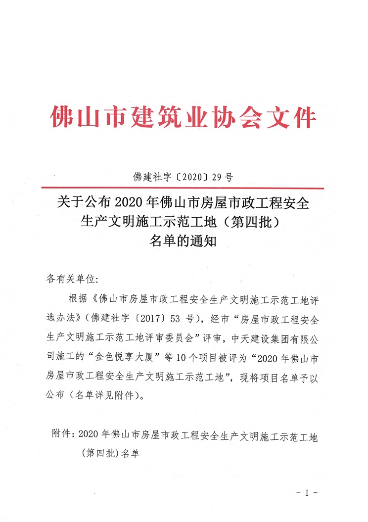 關(guān)于公布2020年佛山市房屋市政工程安全生產(chǎn)文明施工示范工地(第四批)名單的通知(佛建社字〔2020〕29號(hào))