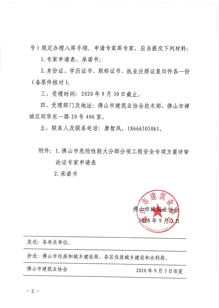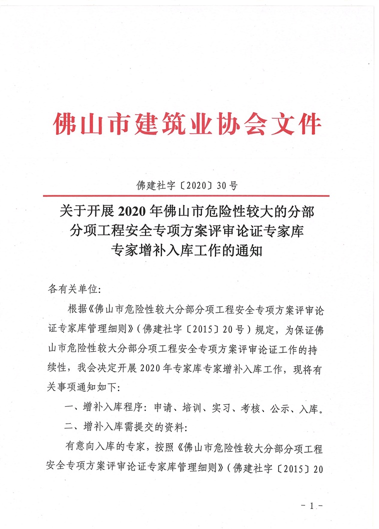 關(guān)于開展2020年佛山市危險性較大的分部分項工程安全專項方案評審論證專家?guī)鞂<以鲅a(bǔ)入庫工作的通知(佛建社字〔2020〕30號)