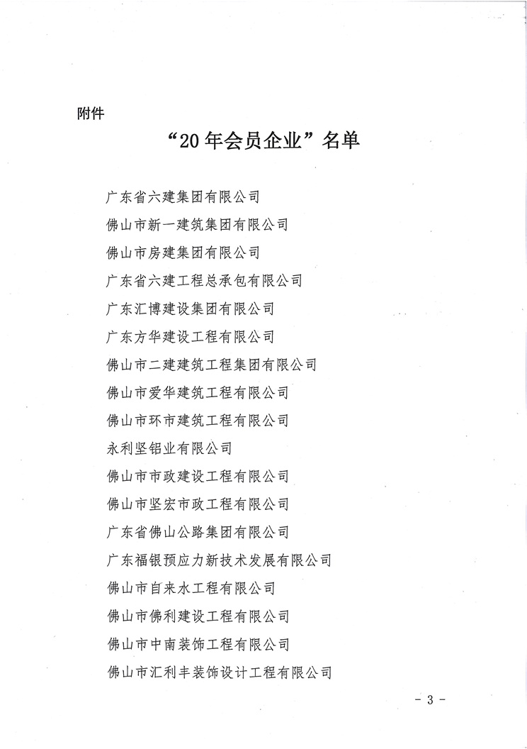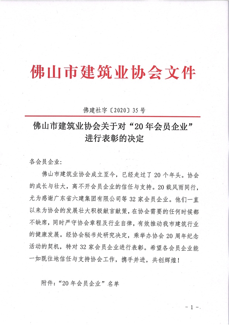 佛山市建筑業(yè)協(xié)會(huì)關(guān)于對(duì)“20年會(huì)員企業(yè)”進(jìn)行表彰的決定(佛建社字〔2020〕35號(hào))