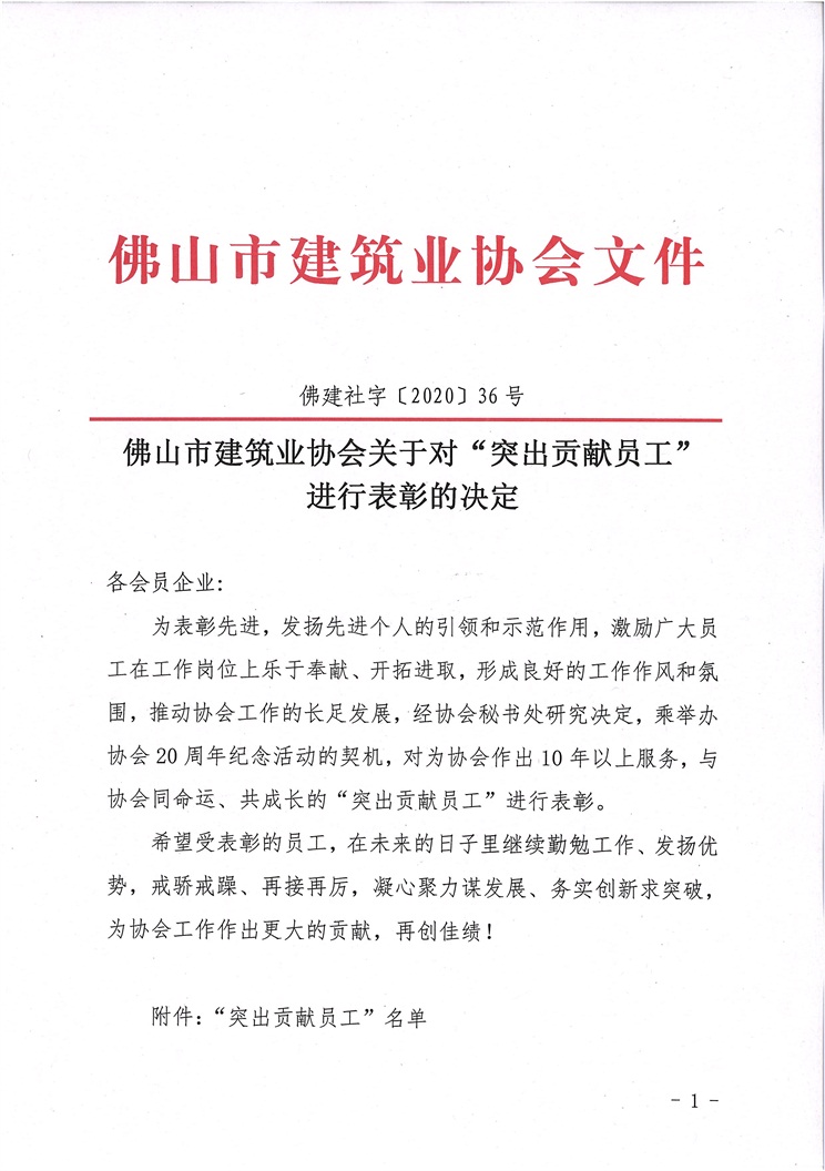佛山市建筑業(yè)協(xié)會(huì)關(guān)于對(duì)“突出貢獻(xiàn)員工”進(jìn)行表彰的決定(佛建社字〔2020〕36號(hào))