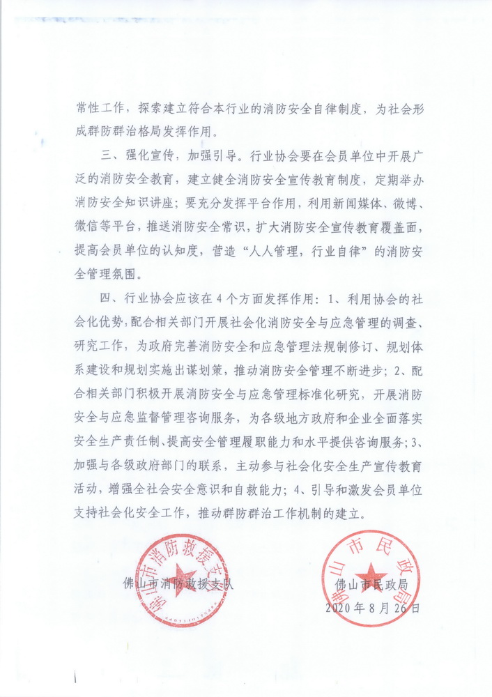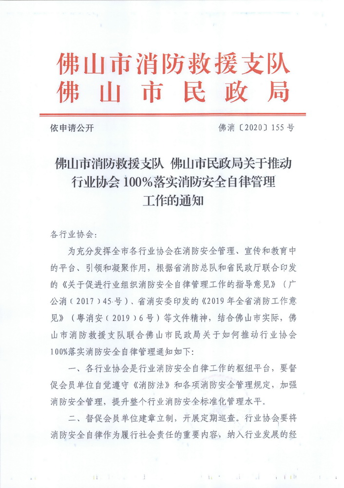 轉(zhuǎn)佛山市消防救援支隊 佛山市民政局關(guān)于推動行業(yè)協(xié)會100%落實消防安全自律管理工作的通知(佛消〔2020〕155號)