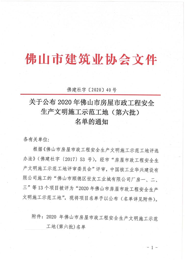 關(guān)于公布2020年佛山市房屋市政工程安全生產(chǎn)文明施工示范工地(第六批)名單的通知(佛建社字〔2020〕40號)
