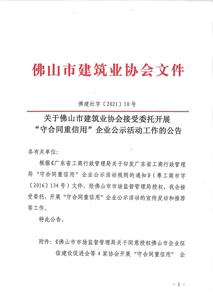 關(guān)于佛山市建筑業(yè)協(xié)會接受委托開展“守合同重信用”企業(yè)公示活動工作的公告(佛建社字〔2021〕10號)