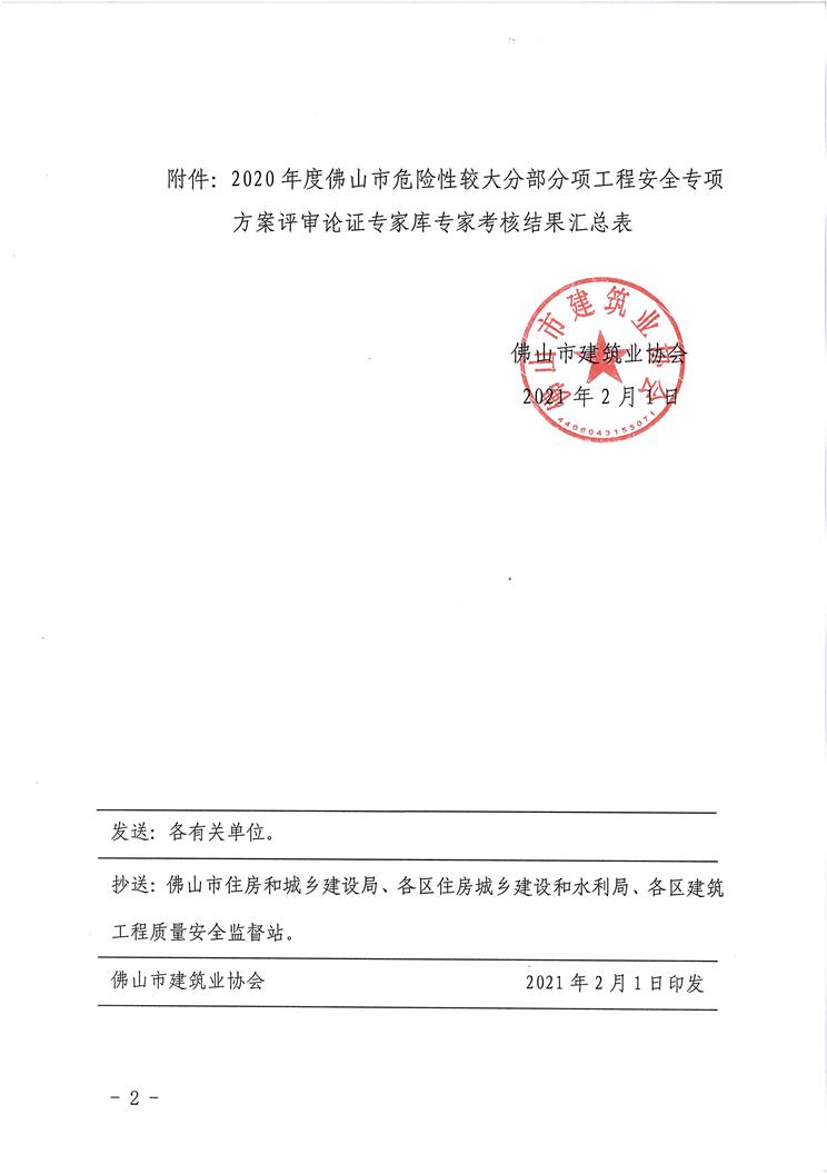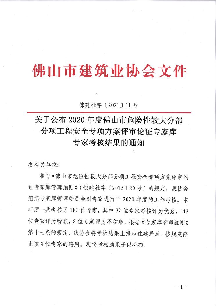 關于公布2020年度佛山市危險性較大分部分項工程安全專項方案評審論證專家?guī)鞂<铱己私Y(jié)果的通知(佛建社字〔2021〕11號)