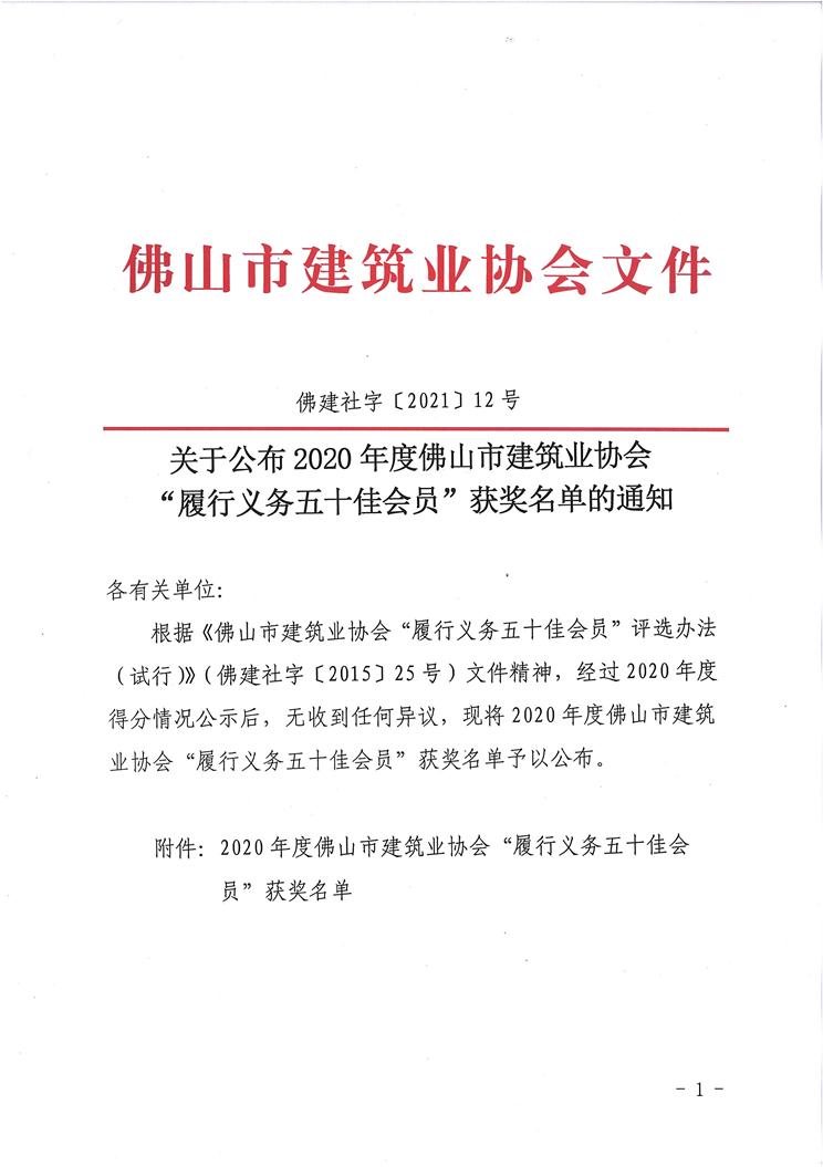 關(guān)于公布2020年度佛山市建筑業(yè)協(xié)會(huì)“履行義務(wù)五十佳會(huì)員”獲獎(jiǎng)名單的通知(佛建社字〔2021〕12號(hào))