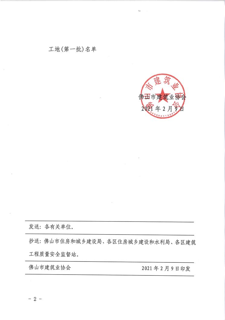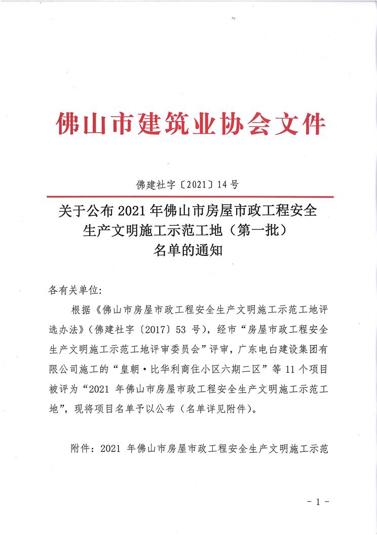關(guān)于公布2021年佛山市房屋市政工程安全生產(chǎn)文明施工示范工地(第一批)名單的通知(佛建社字〔2021〕14號(hào))