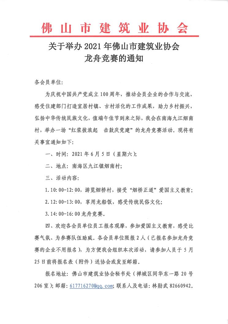 關(guān)于舉辦2021年佛山市建筑業(yè)協(xié)會龍舟競賽的通知(2021/05/12)