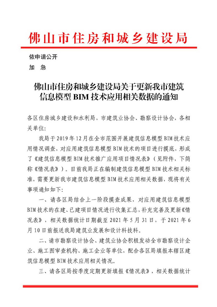 轉(zhuǎn)發(fā)佛山市住房和城鄉(xiāng)建設(shè)局關(guān)于更新我市建筑信息模型BIM技術(shù)應(yīng)用相關(guān)數(shù)據(jù)的通知(2021/06/08)
