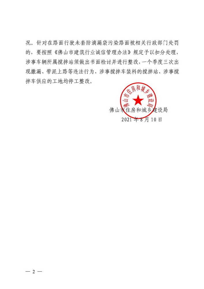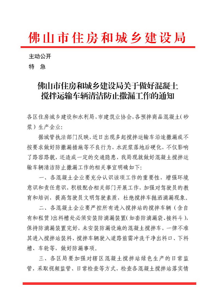 轉(zhuǎn)發(fā)佛山市住房和城鄉(xiāng)建設局關(guān)于做好混凝土攪拌運輸車輛清潔防止撒漏的通知