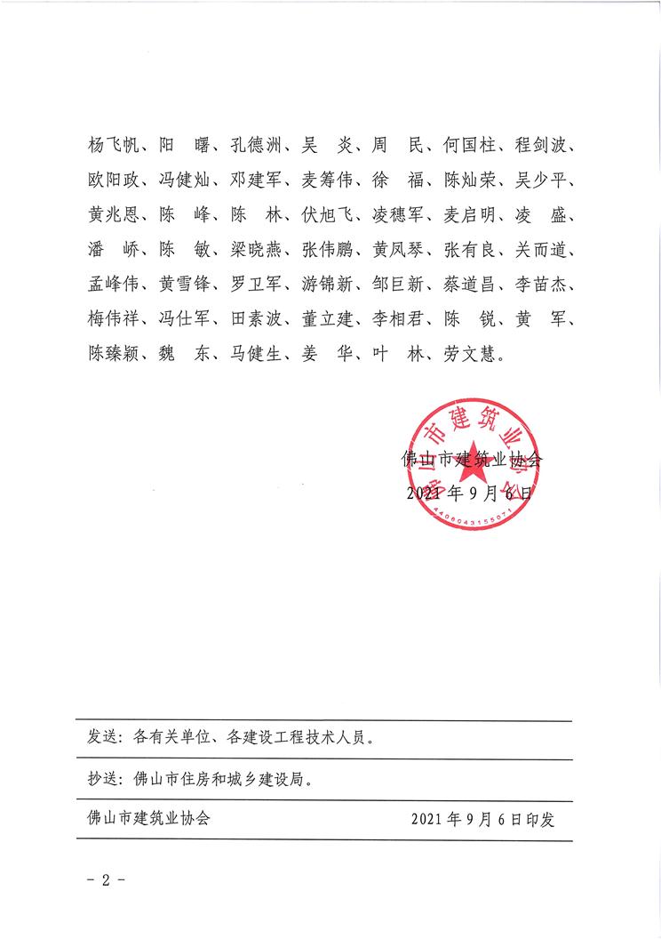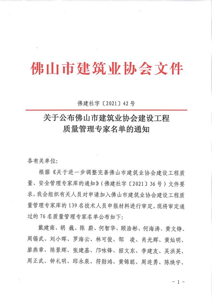 關(guān)于公布佛山市建筑業(yè)協(xié)會(huì)建設(shè)工程質(zhì)量管理專家名單的通知(佛建社字〔2021〕42號(hào))
