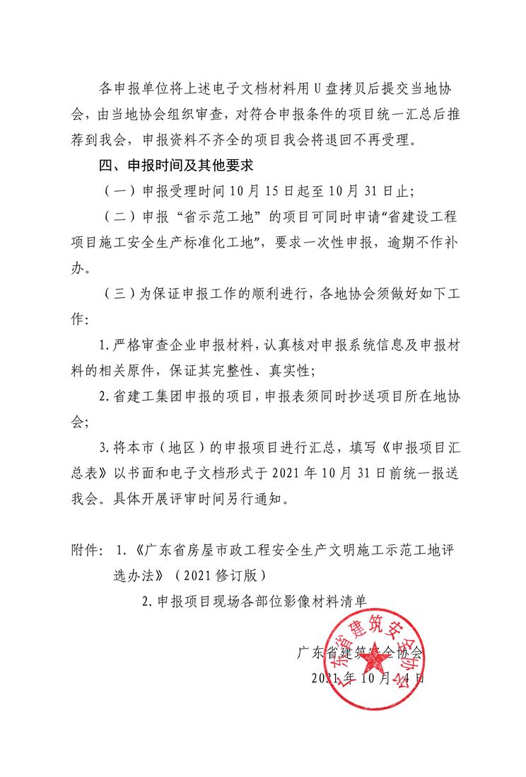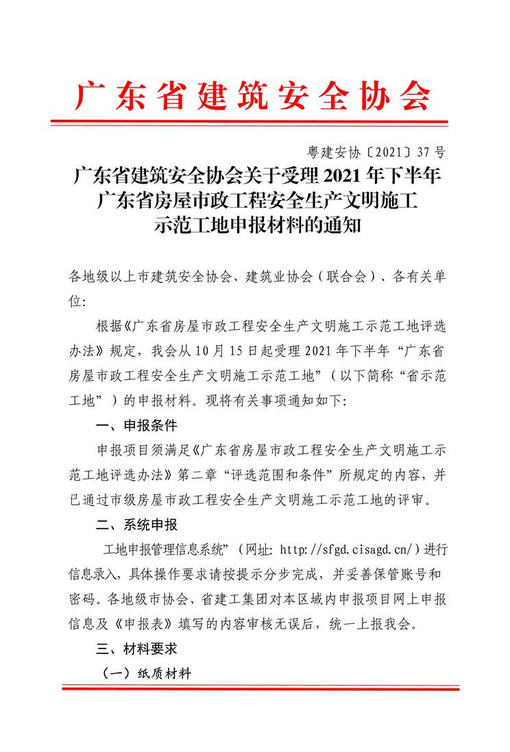 轉(zhuǎn)發(fā)廣東省建筑安全協(xié)會(huì)關(guān)于受理2021年下半年廣東省房屋市政工程安全生產(chǎn)文明施工示范工地申報(bào)材料的通知(2021/10/18)