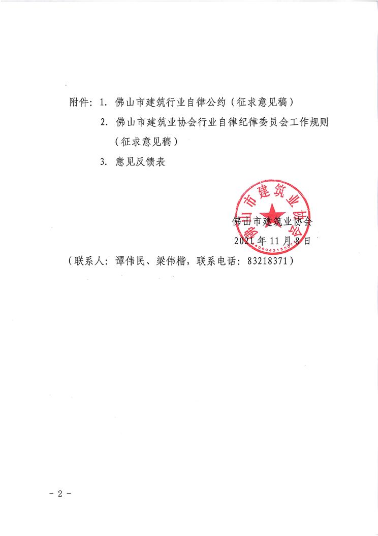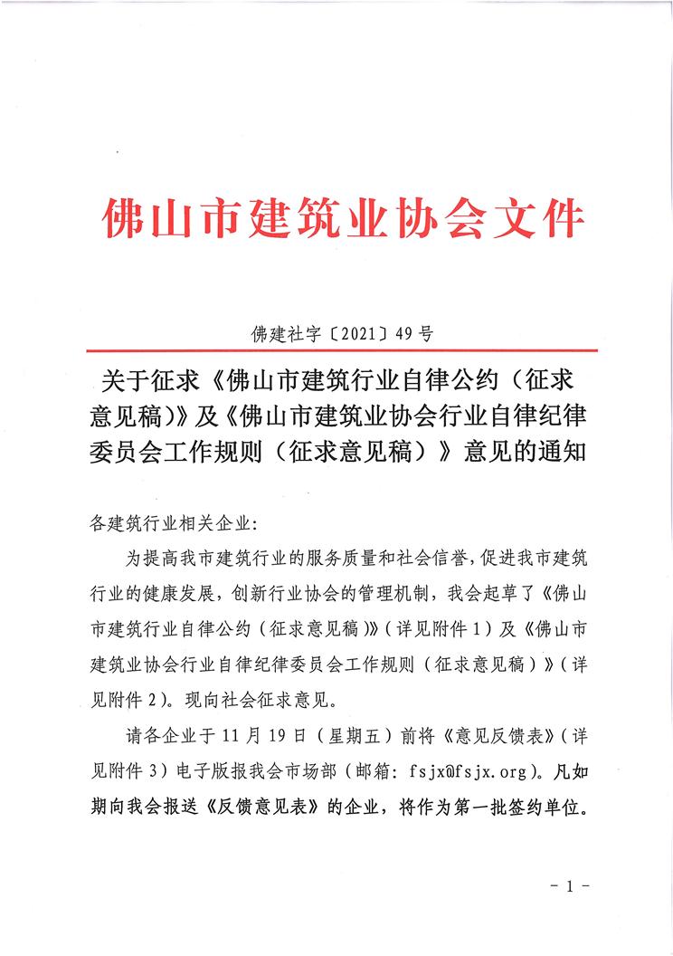 關(guān)于征求《佛山市建筑行業(yè)自律公約(征求意見稿)》及《佛山市建筑業(yè)協(xié)會行業(yè)自律紀(jì)律委員會工作規(guī)則(征求意見稿)》意見的通知(佛建社字〔2021〕49號)