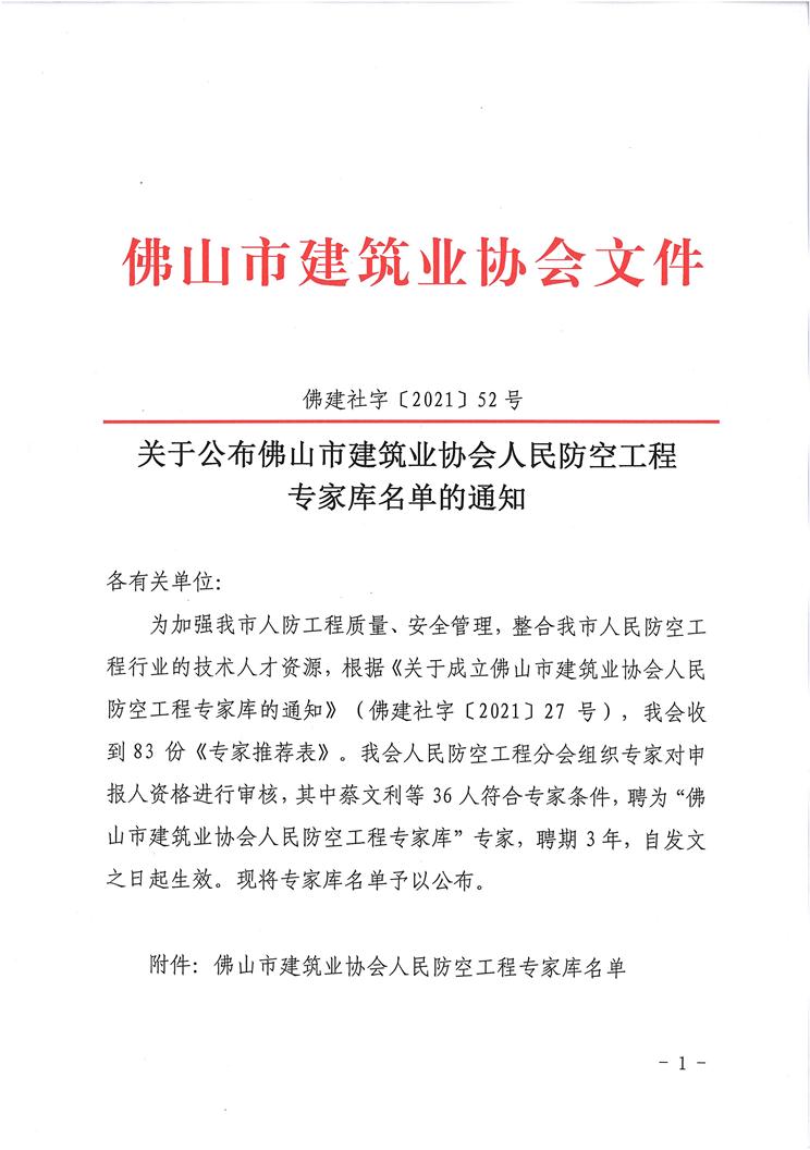 關(guān)于公布佛山市建筑業(yè)協(xié)會人民防空工程專家?guī)烀麊蔚耐ㄖǚ鸾ㄉ缱帧?021〕52號)