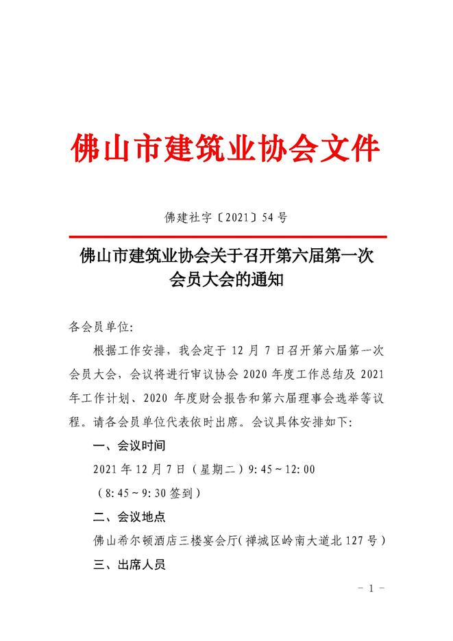 佛山市建筑業(yè)協(xié)會關(guān)于召開第六屆第一次會員大會的通知(佛建社字〔2021〕54號)