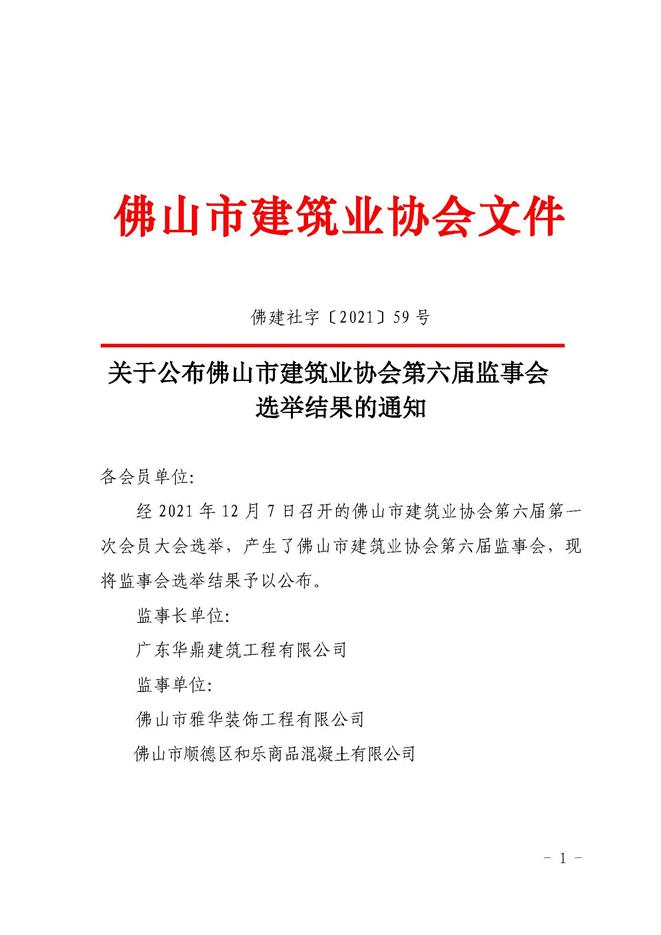 關(guān)于公布佛山市建筑業(yè)協(xié)會第六屆監(jiān)事會選舉結(jié)果的通知(佛建社字〔2021〕59號)