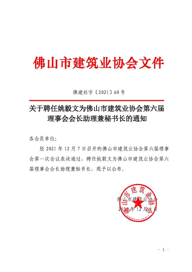 關于聘任姚毅文為佛山市建筑業(yè)協(xié)會第六屆理事會會長助理兼秘書長的通知(佛建社字〔2021〕60號)