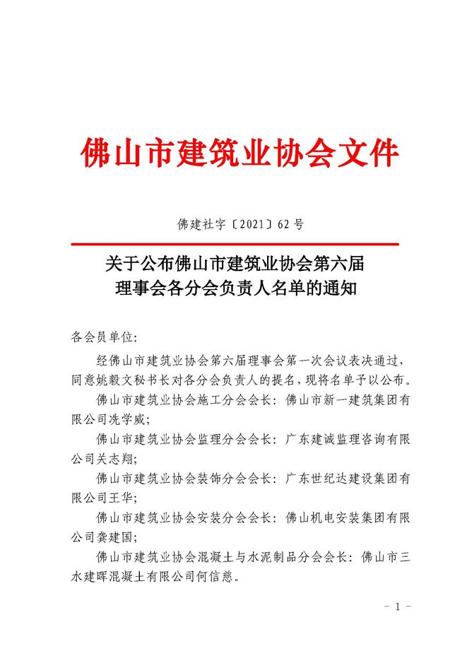 關(guān)于公布佛山市建筑業(yè)協(xié)會(huì)第六屆理事會(huì)各分會(huì)負(fù)責(zé)人名單的通知(佛建社字〔2021〕62號(hào))