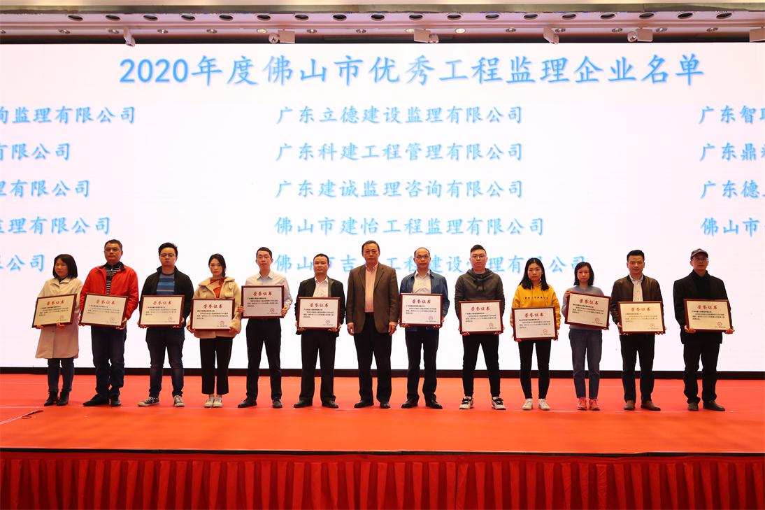 市住建局四級調(diào)研員沈華鑫(中)為我市2020年度優(yōu)秀工程監(jiān)理企業(yè)頒獎