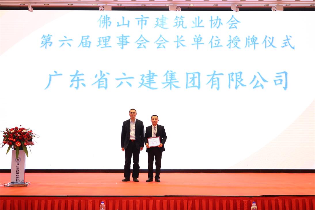 佛山市住房和城鄉(xiāng)建設(shè)局黨組成員、副局長蔡棟倫(左)為第六屆理事會會長魏瓊升(右)頒發(fā)任職牌匾