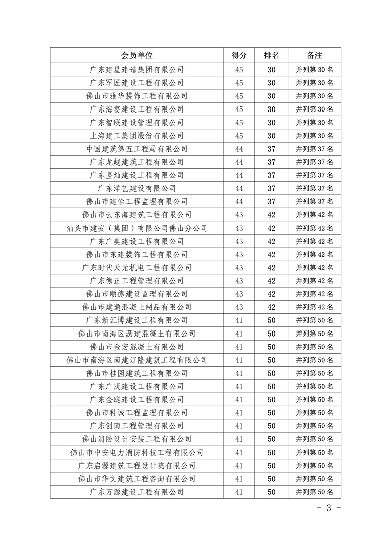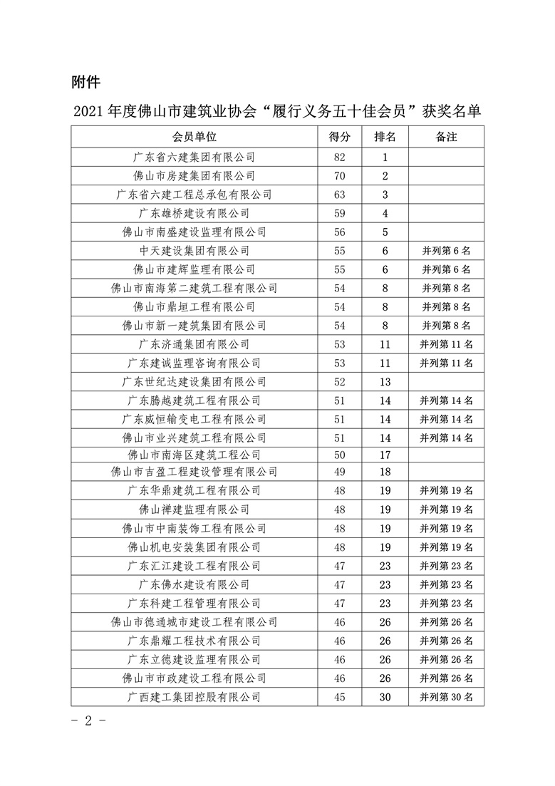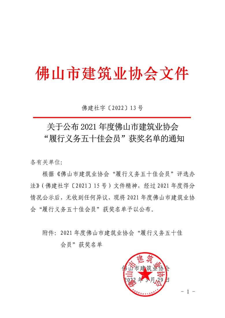 關于公布2021年度佛山市建筑業(yè)協(xié)會“履行義務五十佳會員”獲獎名單的通知(佛建社字〔2022〕13號)