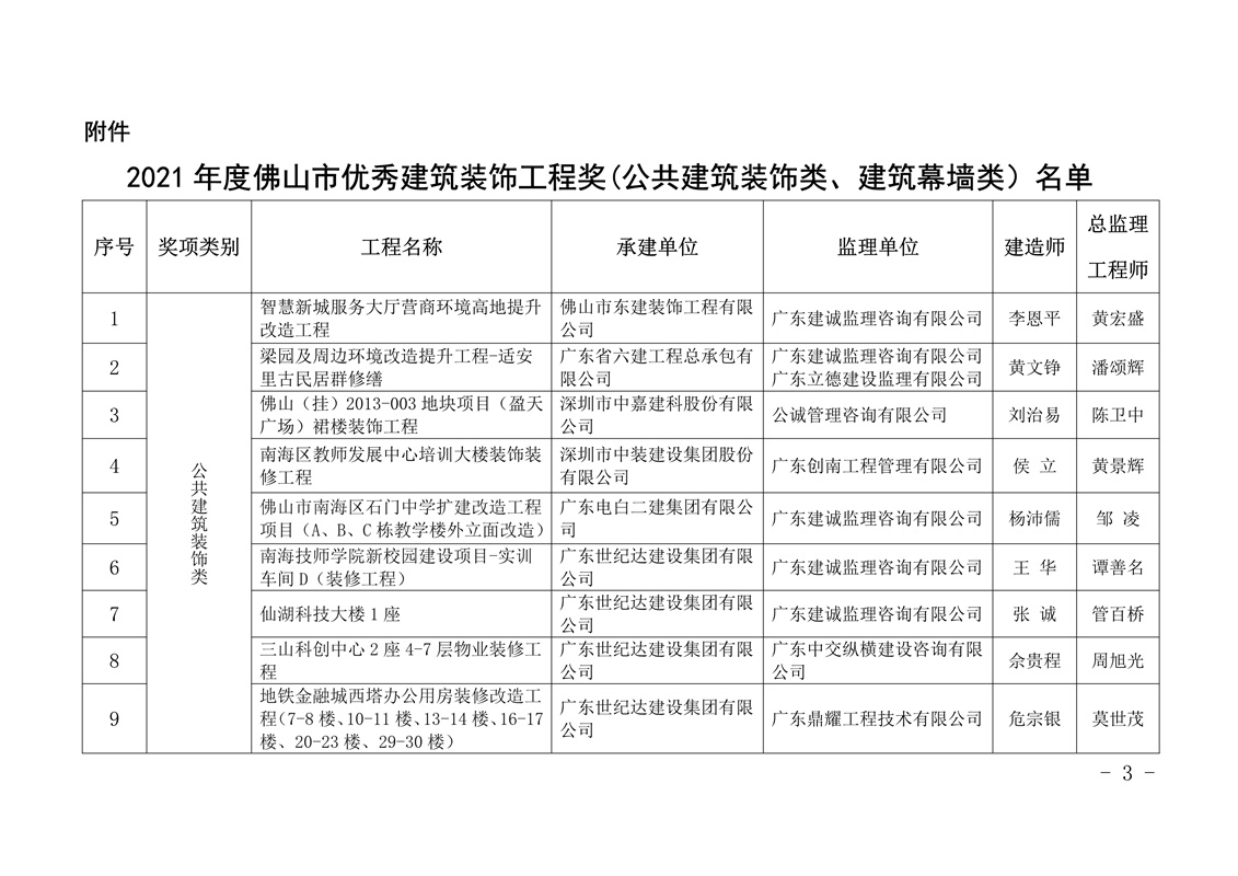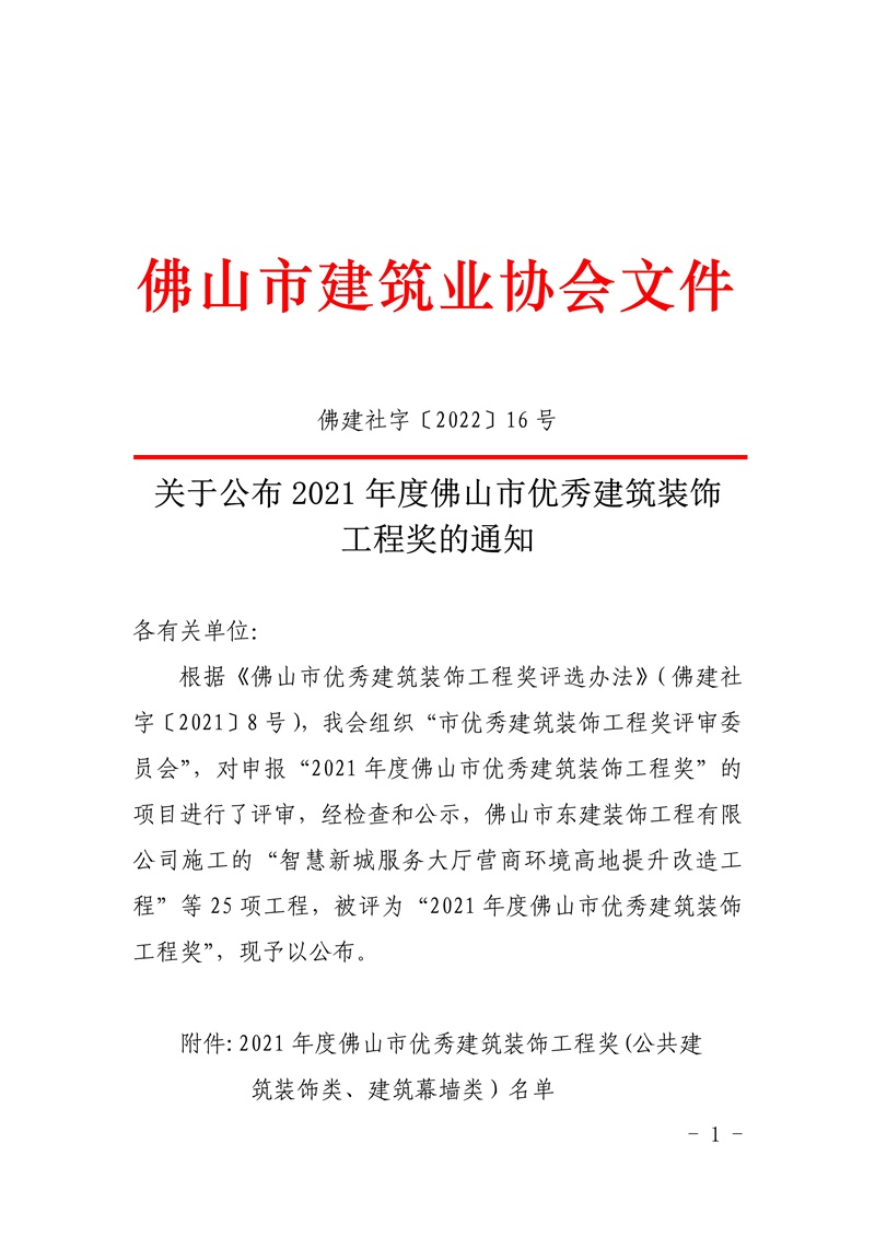 關(guān)于公布2021年度佛山市優(yōu)秀建筑裝飾工程獎(jiǎng)的通知(佛建社字〔2022〕16號(hào))