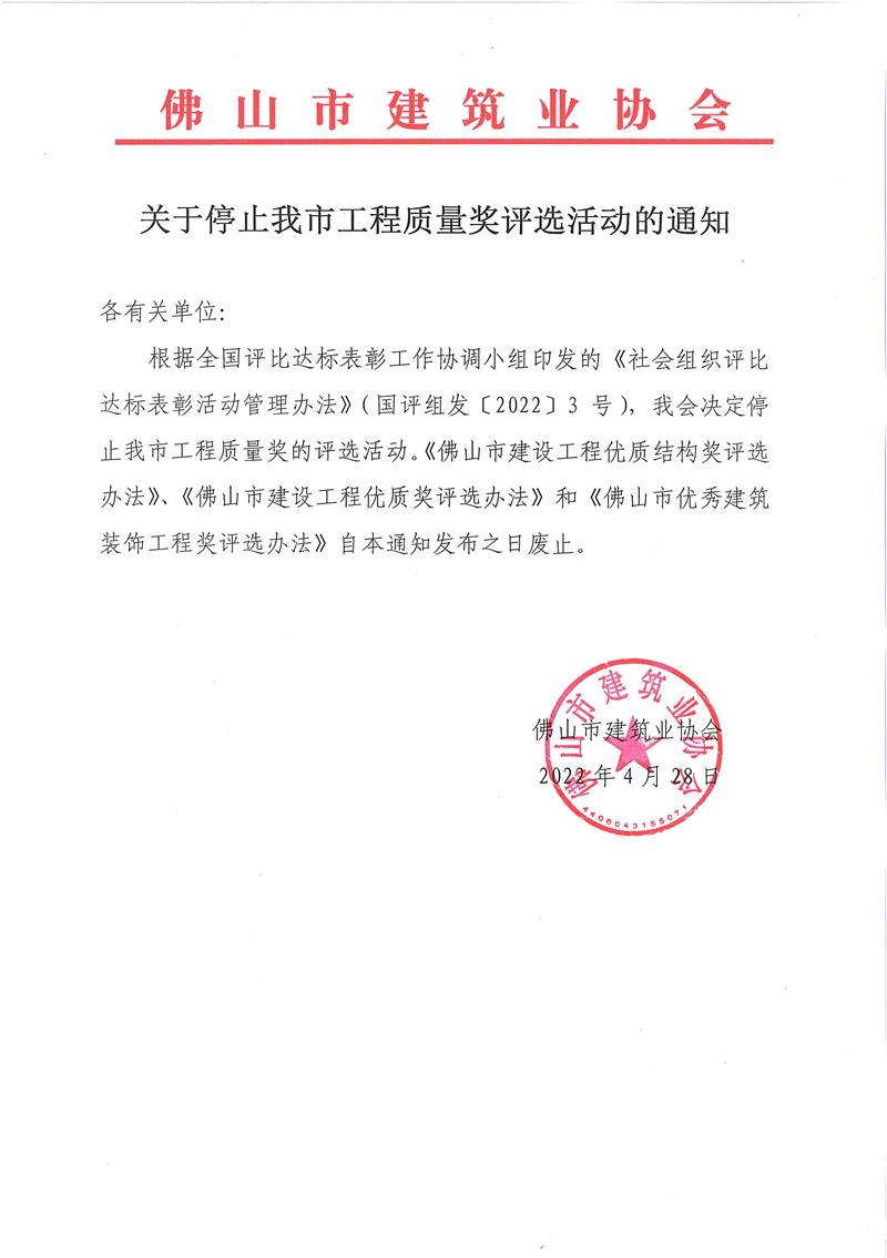關(guān)于停止我市工程質(zhì)量獎(jiǎng)評(píng)選活動(dòng)的通知(2022/04/28)