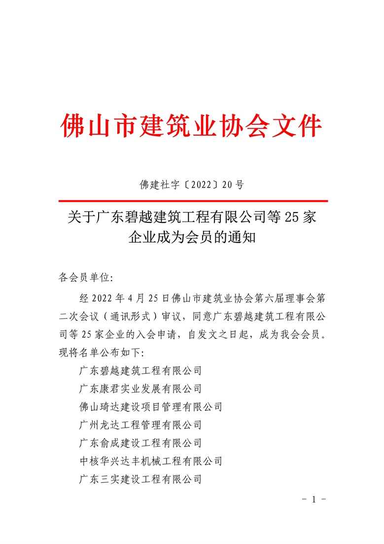 關(guān)于廣東碧越建筑工程有限公司等25家企業(yè)成為會(huì)員的通知(佛建社字〔2022〕20號(hào))