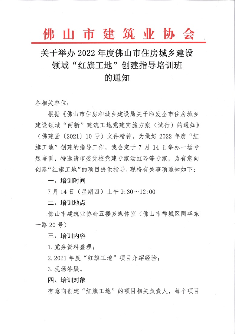 關(guān)于舉辦2022年度佛山市住房城鄉(xiāng)建設(shè)領(lǐng)域“紅旗工地”創(chuàng)建指導(dǎo)培訓(xùn)班的通知(2022/07/07)
