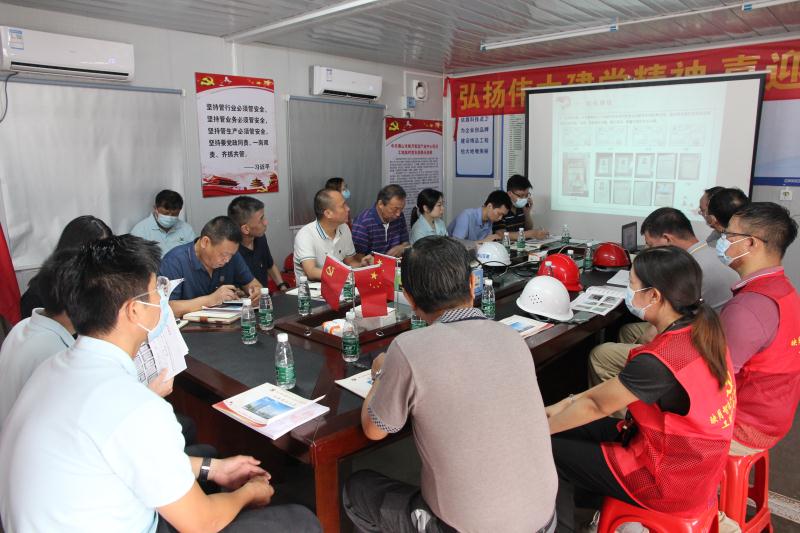 大家在認(rèn)真地聽取映月智造產(chǎn)業(yè)中心項(xiàng)目臨時(shí)黨支部委員黃磊匯報(bào)“紅旗工地”創(chuàng)建情況