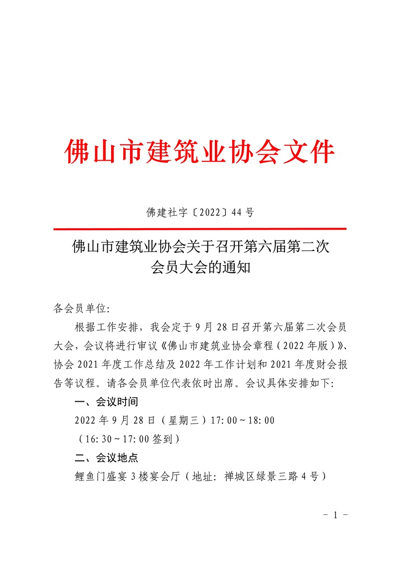 佛山市建筑業(yè)協(xié)會(huì)關(guān)于召開第六屆第二次會(huì)員大會(huì)的通知(佛建社字〔2022〕44號(hào))