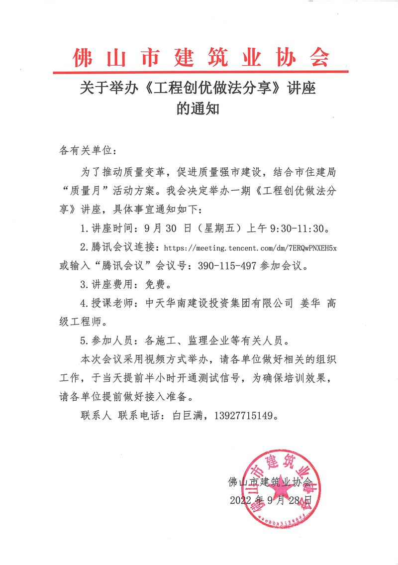 關(guān)于舉辦《工程創(chuàng)優(yōu)做法分享》講座的通知(2022/09/28)