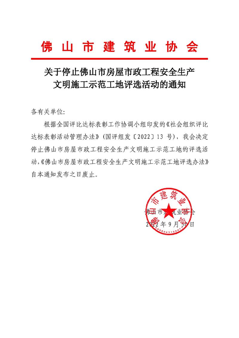 關(guān)于停止佛山市房屋市政工程安全生產(chǎn)文明施工示范工地評(píng)選活動(dòng)的通知(2022/09/30)