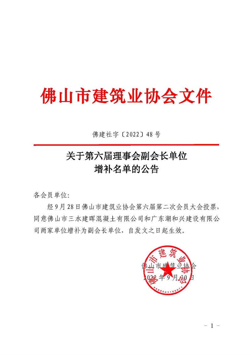 關(guān)于第六屆理事會(huì)副會(huì)長(zhǎng)單位增補(bǔ)名單的公告(佛建社字〔2022〕48號(hào))