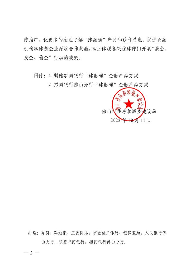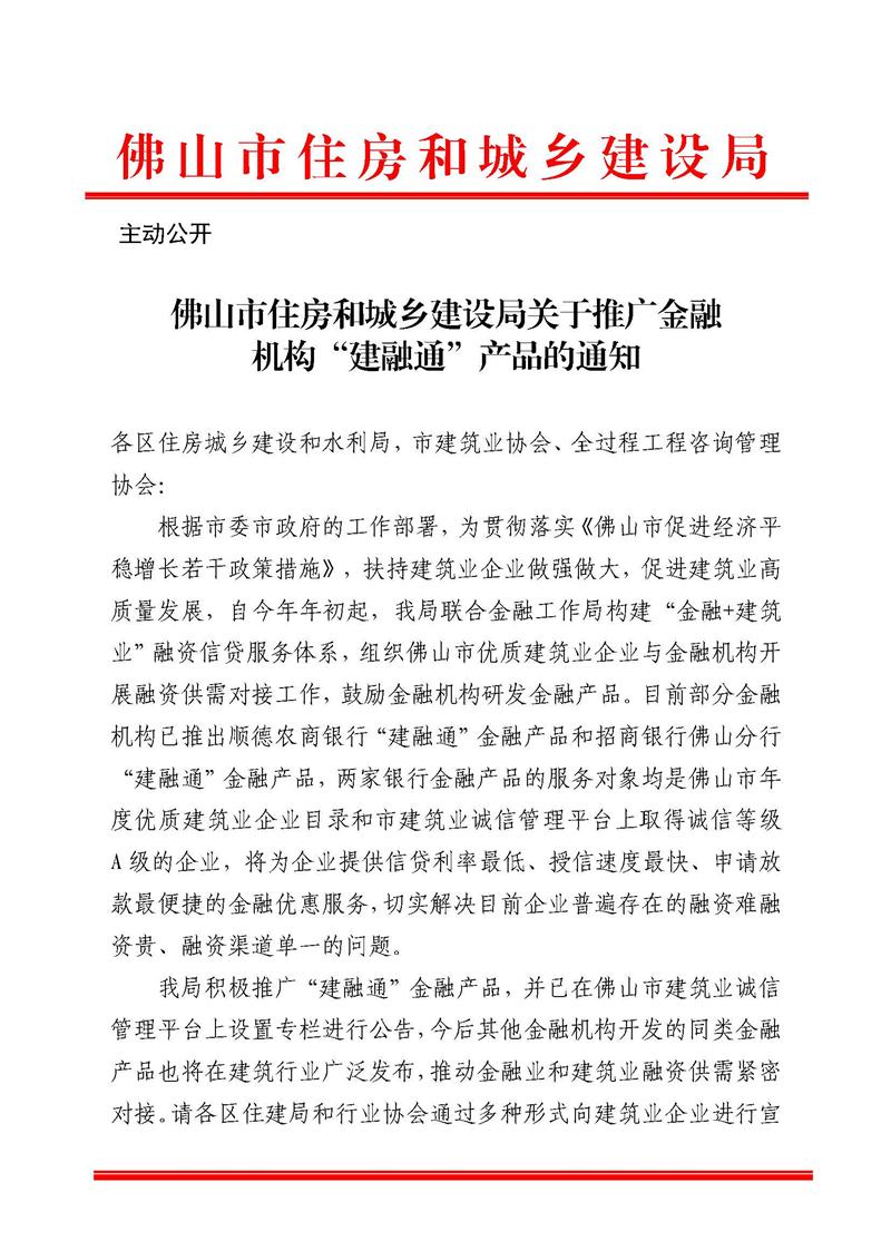 轉(zhuǎn)發(fā)佛山市住房和城鄉(xiāng)建設(shè)局關(guān)于推廣金融機(jī)構(gòu)“建融通”產(chǎn)品的通知(2022/10/12)
