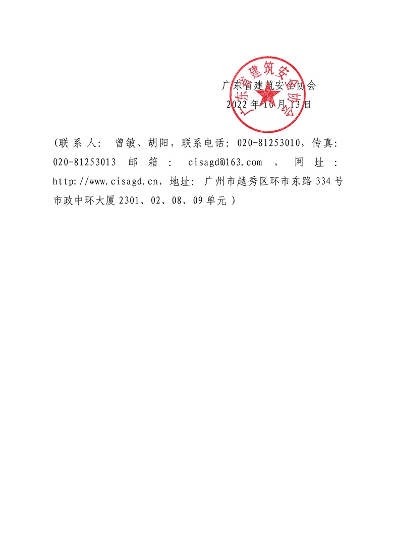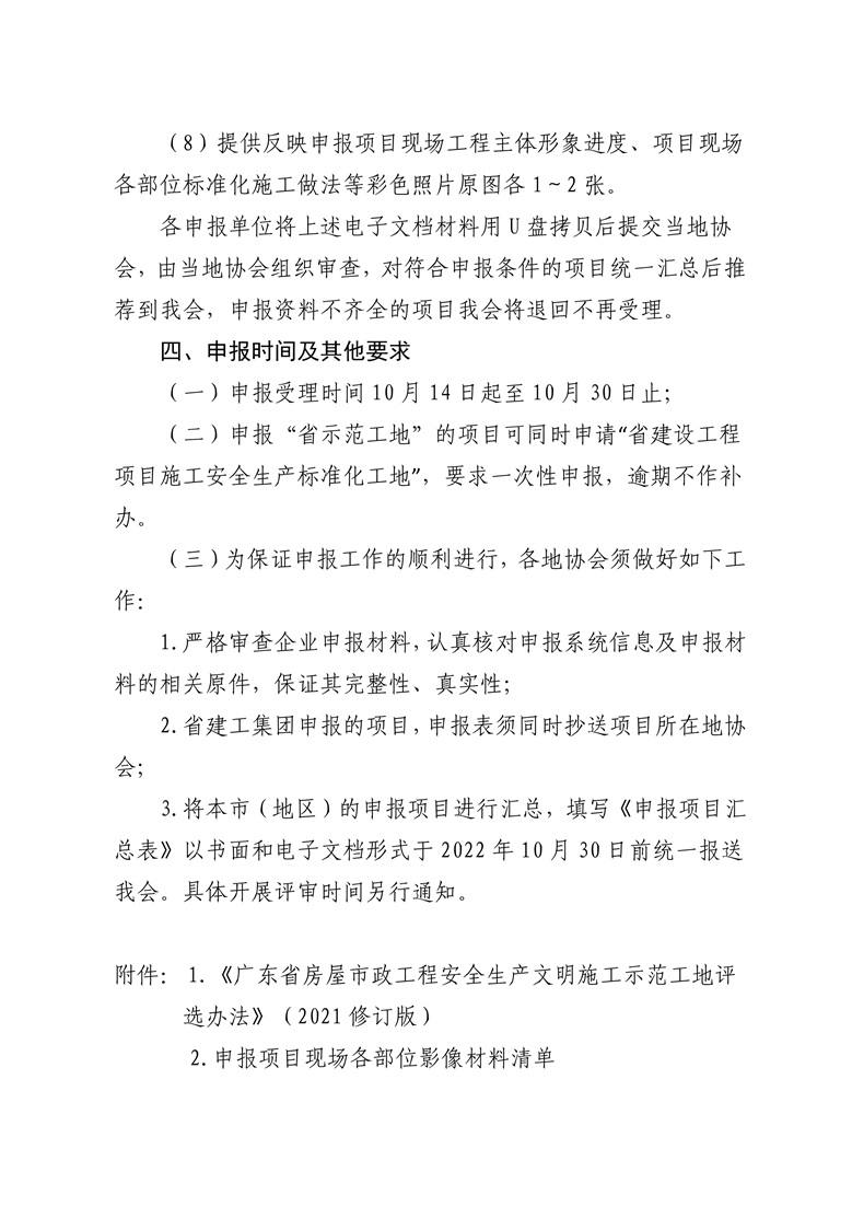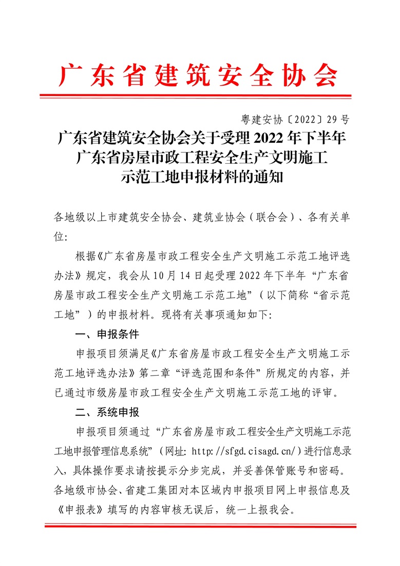 轉(zhuǎn)發(fā)廣東省建筑安全協(xié)會關(guān)于受理2022年下半年廣東省房屋市政工程安全生產(chǎn)文明施工示范工地申報材料的通知(2022/10/14)