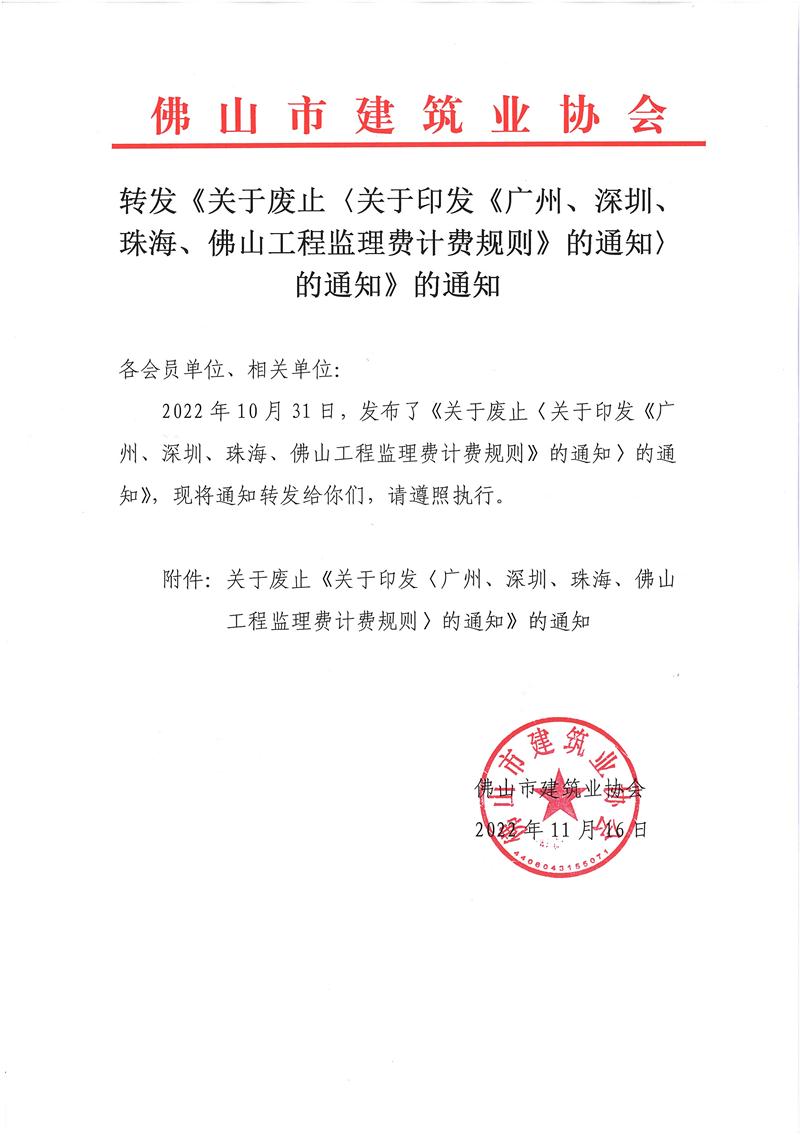 轉(zhuǎn)發(fā)《關(guān)于廢止〈關(guān)于印發(fā)《廣州、深圳、珠海、佛山工程監(jiān)理費計費規(guī)則》的通知〉的通知》的通知(2022/11/16)